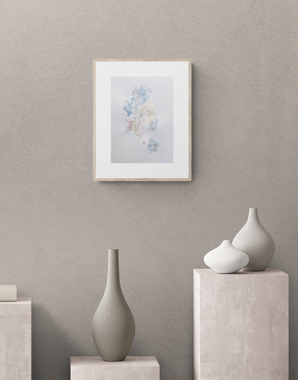 Beautiful glimmer arises in the work when the light falls on it as it´s painted with gold and silver watercolour in selected places.